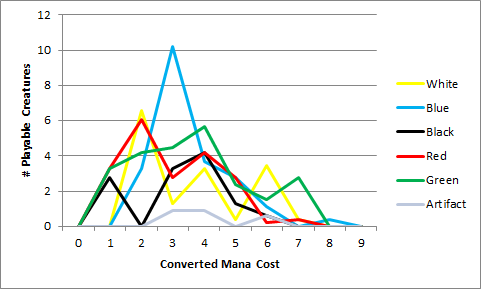 Surprisingly, there are only 2 non-rare cards that produce tokens, cost 4cc or less, and don’t have a high setup cost: Raise the Alarm and Coral Barrier. The first card on the list confirms an intuition I’ve had for some time now: Raise the Alarm is the key enabler for convoke decks, not just because it enables some of the god draws, but because it’s one of the only cheap ways to get multiple creatures on the table. However, having Coral Barrier be the only other card on the list challenges my preconceived notion that, since 59% of the convoke cards are in green or white, the convoke deck should be G/W.